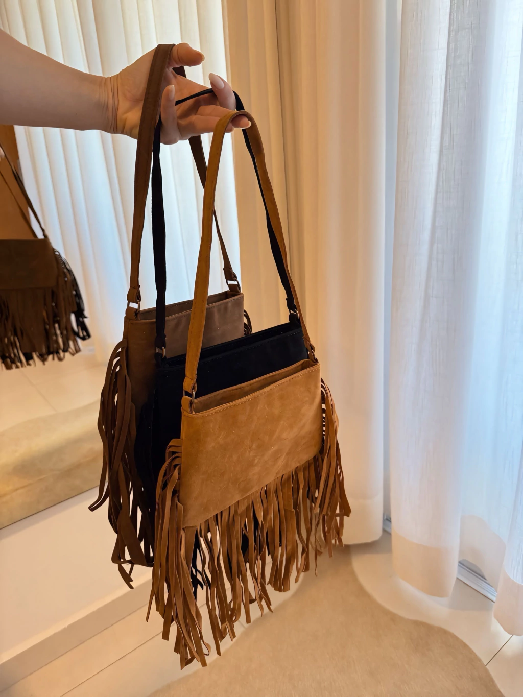 Confeccionada em couro camurça de alta qualidade, a bolsa apresenta uma textura suave e sofisticada, enquanto as franjas adicionam um toque boho irresistível. Com um design compacto, ela é perfeita para levar o essencial com você.