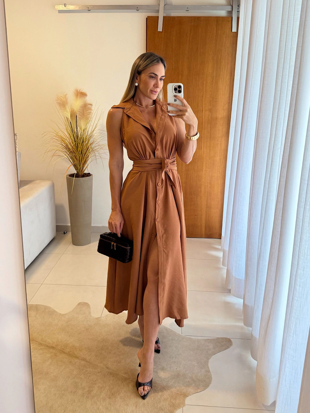 Chemise Eloah, uma peça elegante e atemporal confeccionada em tecido viscolinho de gramatura ideal. Seu caimento impecável traz um toque de sofisticação, perfeito para quem busca conforto sem abrir mão do estilo e elegância.