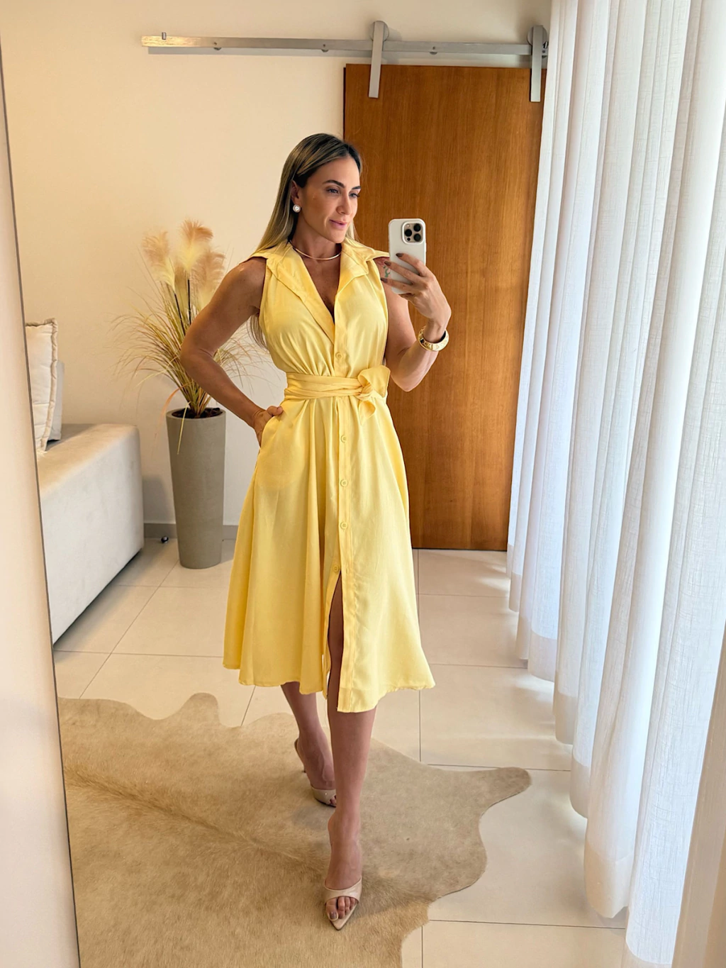 Com botões frontais que se estendem até a altura do joelho e uma faixa para amarrar na cintura, este modelo valoriza a silhueta de forma delicada e feminina. O corte fluido garante movimento e charme em cada detalhe.
