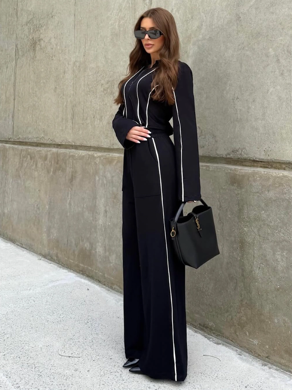 A calça possui elástico na cintura, proporcionando ajuste perfeito e confortável, enquanto a blusa conta com zíper frontal, permitindo um ajuste personalizado e praticidade para compor seu look. O design com riscas brancas adiciona um toque sofisticado e atual à peça.