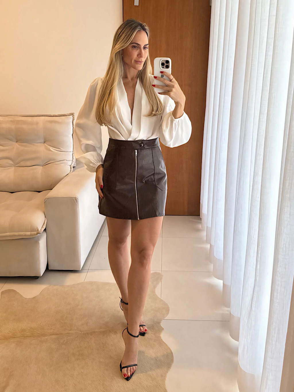 A saia em couro eco croco é a peça que faltava no seu guarda-roupa! Com um design elegante e moderno, ela é perfeita para compor looks que vão do dia a dia a ocasiões especiais.